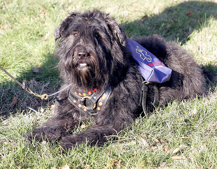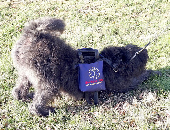 This is Jules, the natural eared and tailed Bouvier girl from Frank and Dyna's (Dyna takes all the credit) litter in Feb, 2009. She stayed with us for her first 10 1/2 months and here is getting ready to hop in the car to go check out her future human companion. Jules is going to be a working girl and is decked out in the harness that her dad Frank, her great Aunt Caprice and great grandpaw Sam all wore when they held the responsibility of being Sue's service Bouvier. Now she is going to be a 4th generation service dog for another human and carry on the tradition of the Bouviers from the Echo Bouvier Kennel.