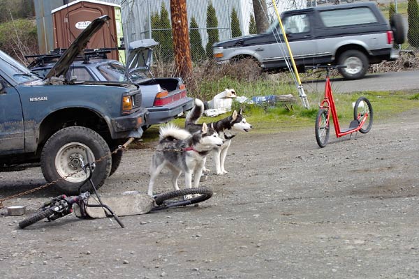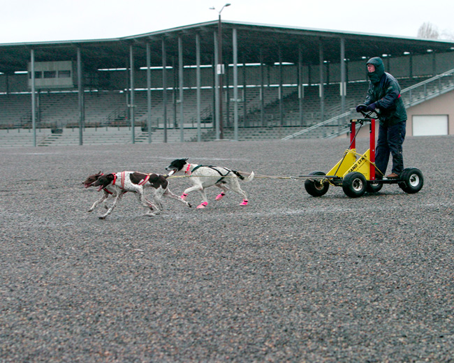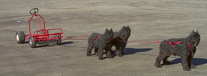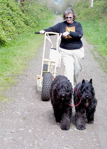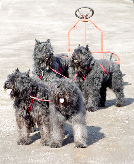 Sue's trademark cart that she uses more than any other is the Grahm Carriage made by Bob Grahm. Here are 3 of our Bouviers resting after going for a spin: ![]() Another type is what is called a sled dog training cart or mushing rig. These are used a lot by those with sled dogs so they can train and keep their dogs in training even if the months without snow. With the pulling power of the Bouvier, they can easily pull this heavier rig, although most Bouvs don't pull with the same speed as some of the traditional sled dogs. I like to say that a team of Bouviers will pull you up the side of a mountain... but they will do it in their own time. ![]() Here are 4 of them on a gang line: ![]() Although these are not Bouviers pulling this Lynx cart, this is an example of a smaller, lighter version of a 4 wheel cart. I was interested in buying one of these but never got around to it. Here is is being demonstrated to Sue and I one cold, rainy, Dec. day. ![]() We had brought our 2 wheel ATV scooter with us when we met the woman with the Lynx cart. She wanted to try it out. As I said above, the Bouviers have their speed and at least for ours, it isn't really fast enough to keep this heavy of a scooter going fast enough to stay balanced. But her one GSP had that thing just a spinning around the fairground parking lot. Several of our Bouvs were watching but I don't think they were all that impressed. ![]() Here is the Bouvier Speed for this scooter: We have a couple of more types, a 4 wheel wagon and a lighter scooter that I've not had a chance to take pictures of yet. When I do, I'll post those as well. The lighter scooter we have looks like these here: ![]() Mike |