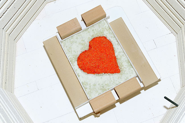 At this point I had a couple of choices. I could fire it again to smooth out the top, maybe adding more frit to the heart to keep it 3D looking or I can do a flip and fuse and bring the bottom to the top, fire polishing it at the same time as flattening the top (which is now the bottom. I decided to go with a fuse with the top facing up and a longer hold time at the top 1485 temp.