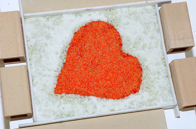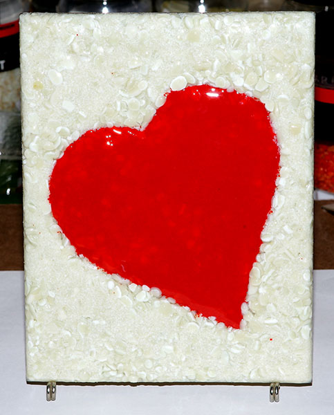 I laid the base glass down and put the fiber paper strips around the edges. I then placed the heart cookie cutter mold in the middle and put a layer of Pimento Red coarse sized frit (about 1/8" and less in size chunks of ground glass). The stainless steel cookie cutter was not perfectly flat along the edges so I pressed down on it while I put in the bulk of the frit I was using for the heart. This sorta kept it from sliding out from underneath (although it wasn't completely successful). While still pressing down on the heart mold, I poured in the coarse French Vanilla that I used to surround the heart. Once I had a good layer around it, I removed my hand from the mold. Then I added on top of that fine sized (sand grain size) frit to fill in the gaps between the larger coarse frit.