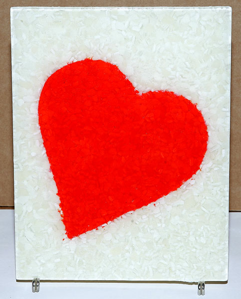 I got home this afternoon and took a look at how the above heart plate came out. It did pretty good. The French Vanilla frit smoothed out nicely and the heart fused to that. I have to grind the edges to take out some little jagged glass (fiber paper, which I had around the edges to keep the frit on the sheet of glass, will cause jagged points) and I'll fire polish it again to smooth everything out.