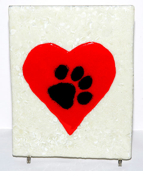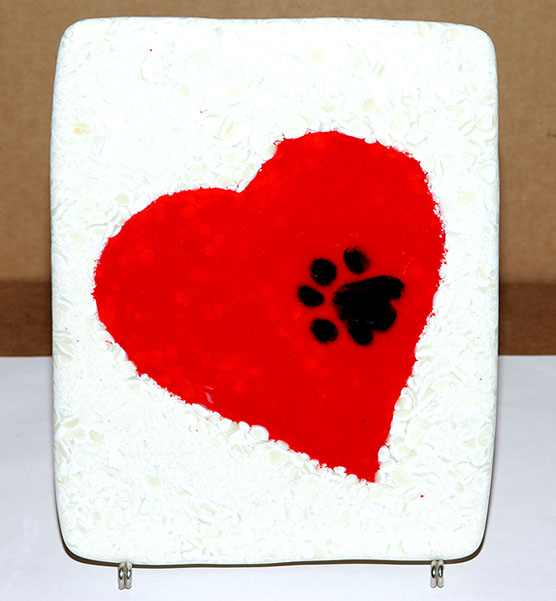 I think the paw is too big, but I can make it smaller in others. I'll work with different sizes and see what looks the best. But I think for a test, it's coming out pretty good. I'll take what I'm learning from these and hopefully improve the next ones I make. One thing I'm going to do is add some wire so they can be hung. The plate is a little heavy to hang from a suction cup type hook, but would be ok from a screw hook of some kind. I am going to try and do a few without the layer of frit and just use a colored piece of glass underneath for the heart to rest on. I just need to try a few colors to see what goes best with it.