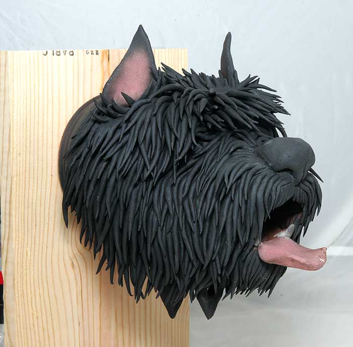 This is a birdhouse made in the image of one of our Bouviers, Frank. Read about it in the thread in the Dog Art and Craft section.